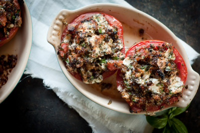 7. Place the tomato halves in a casserole dish, and fill with the bread crumb mixture.