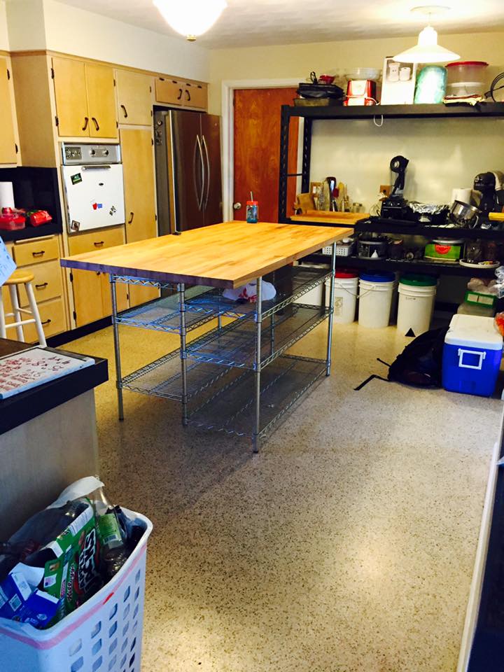He built me this awesome island with a butcher block counter top (eeek!) and converted one of his shop shelving units into another counter area for me.